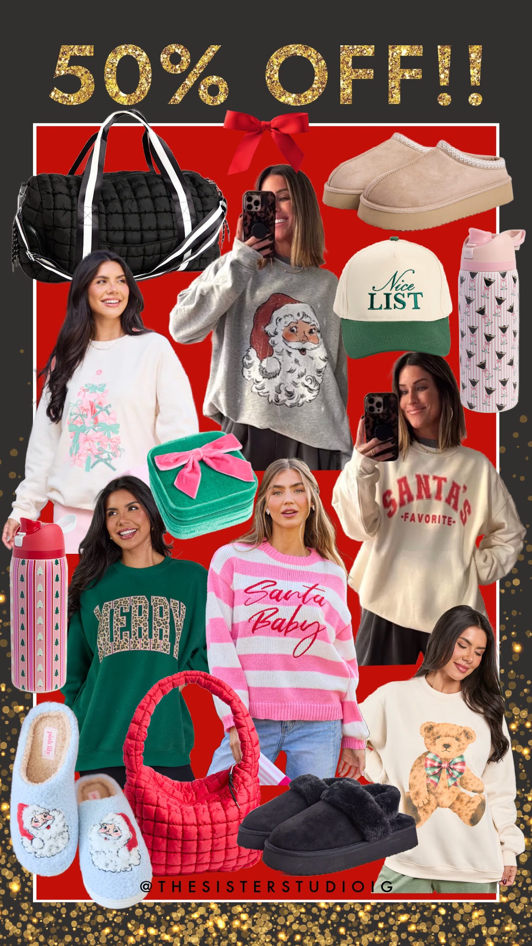 Black Quilted Duffle Bag // Bow Tree Cream Sweatshirt // Slippers // Red Quilted Carry All Bag // Black Slingback Platform Slippers // Teddy Bear Sweatshirt // Santa Baby Sweater//Merry Sweatshirt //Santa’s Favorite Sweatshirt // Trucker Hat // Santa Face Sweatshirt// Water Bottle// Slippers // Jewelry Box // Blanket