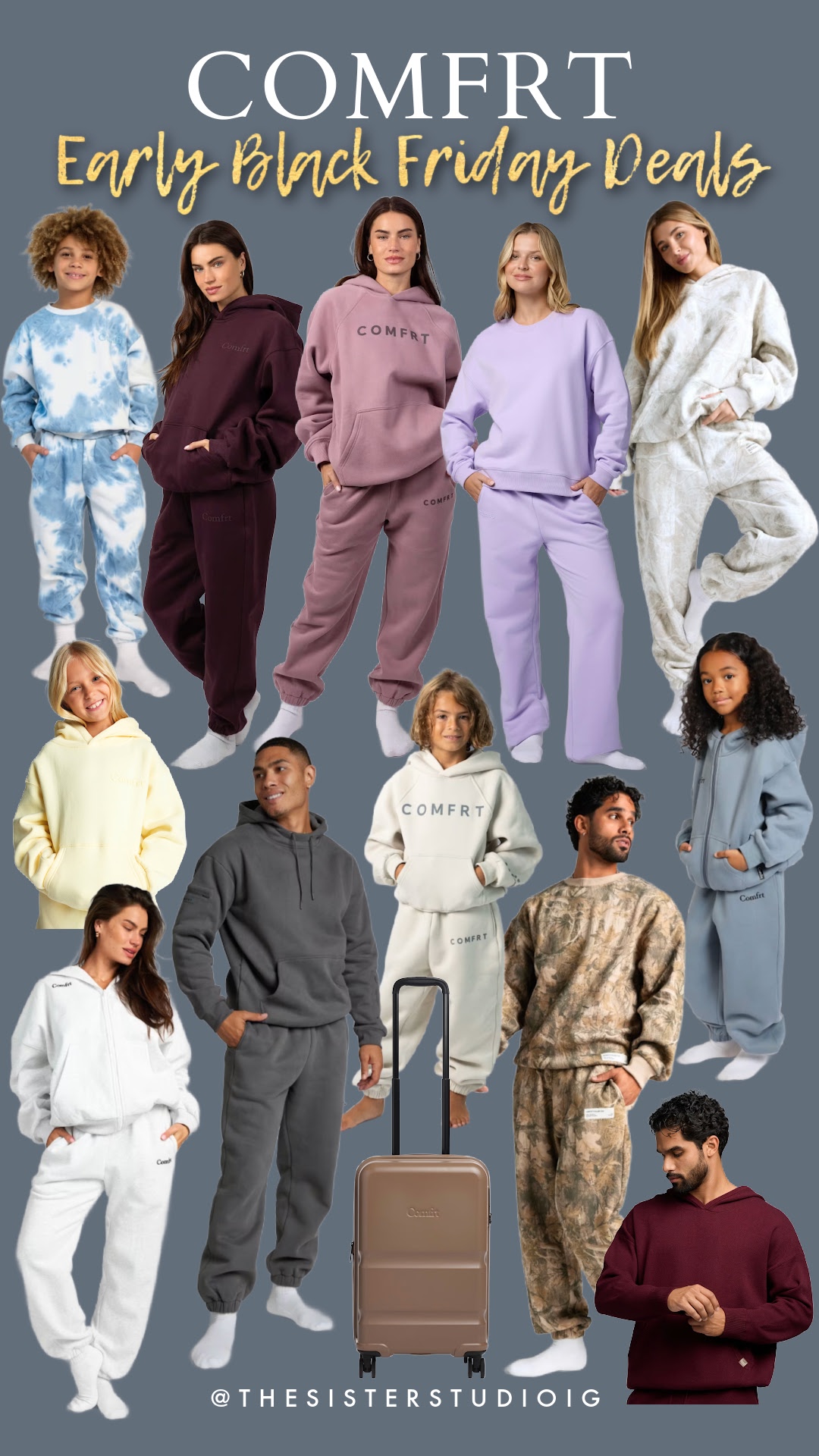 Bottom Row: Zip Hoodie // Sweatpants // Luggage //Camo Crew // Camo Sweatpants // Hoodie // Sweatpants // Knit Hoodie