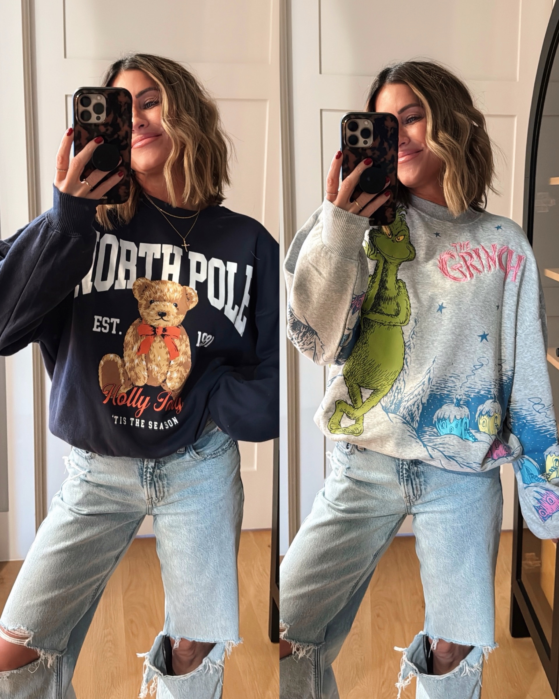 Sweater //Sleeper Shorts//Mom Jeans // Socks // Long Sleeve T-Shirt //Mom Jeans // Cable-Knit Quarter Zip Sweater // Off Shoulder Sweatshirt // Flannel //Grinch Sweatshirt // Classic Crew Neck Sweater // Ripped High-Waisted Jeans // Henley T-Shirt // Jeans // Sweater