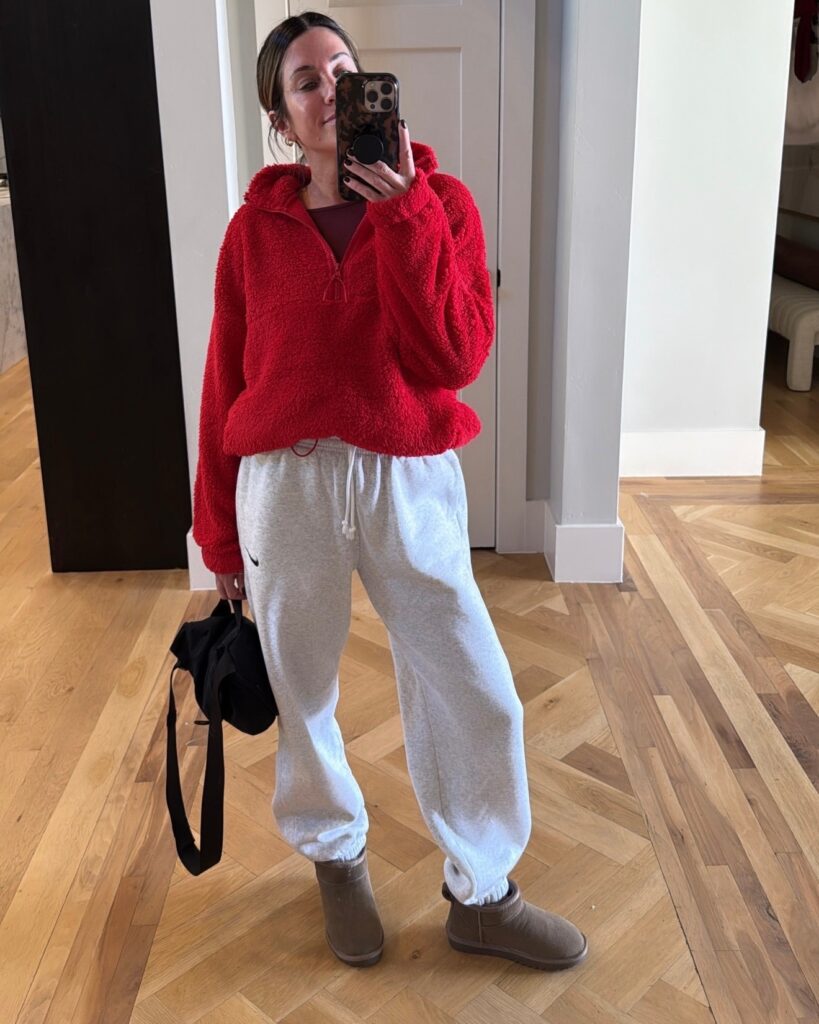 Sweatshirt // Fleece High-Waisted Oversized Sweatpants // Boots // Crossbody Bag