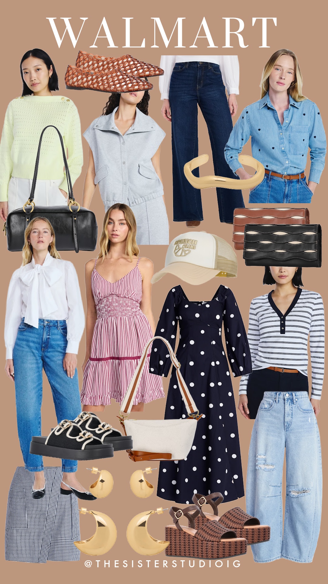Sweater// Shoulder Bag // Tie Neck Blouse //Jeans// Skirt // Buckle Slide Sandals // Earrings // Wedge Sandals // Crossbody //Jeans//  Ruffle Smocked Mini Dress // Barrel Jeans // Maxi Dress // Long Sleeve // Hat // Wallet // Handbag // Bracelet // Embroidered Hearts Denim Shirt