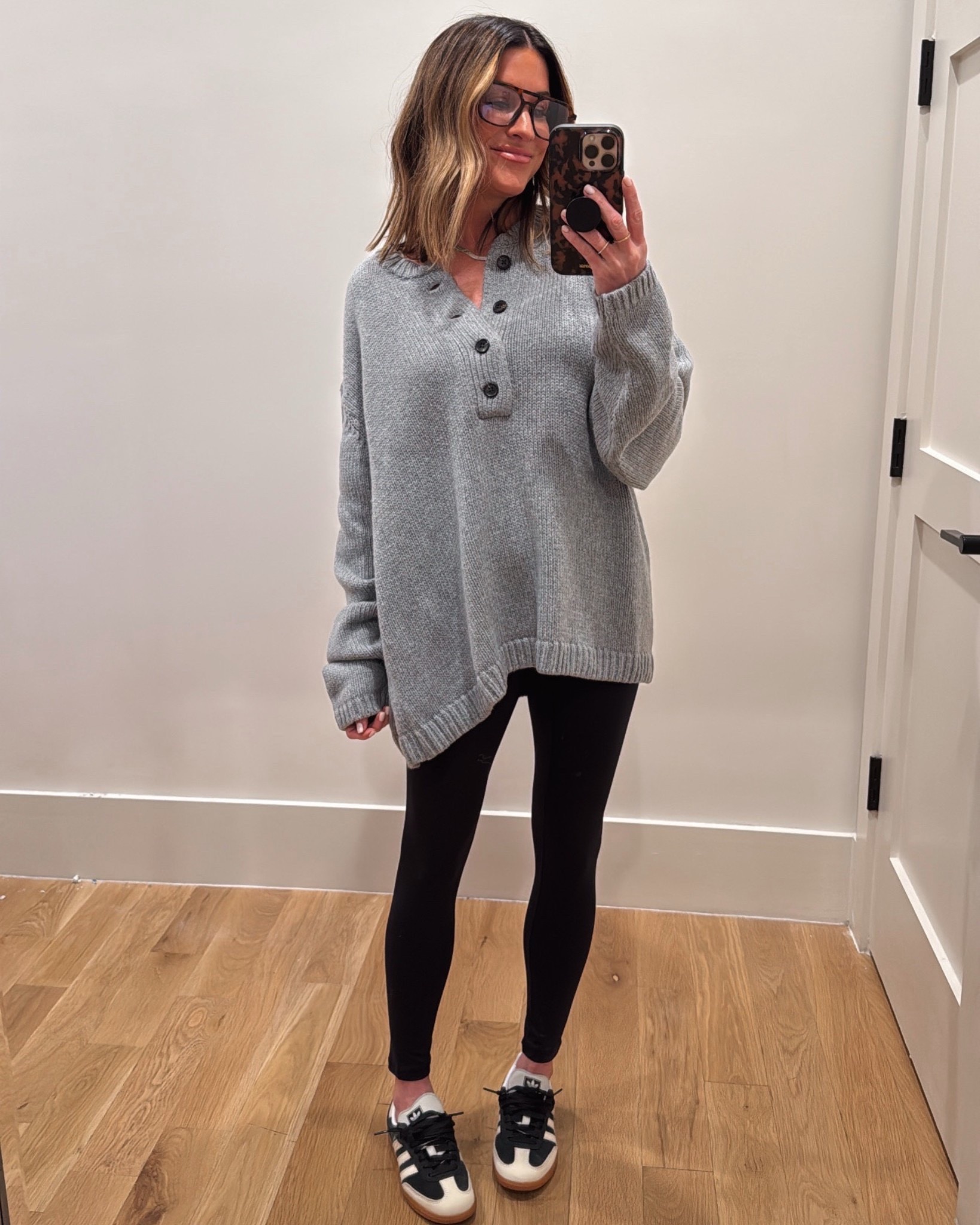 Wearing size medium in this sweater, I sized up for an oversized fit.