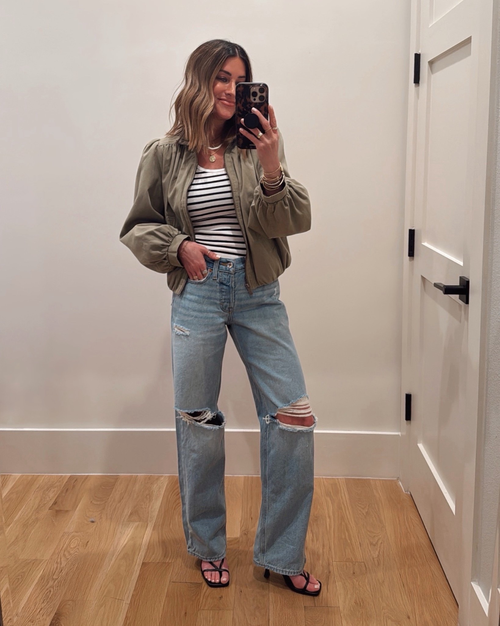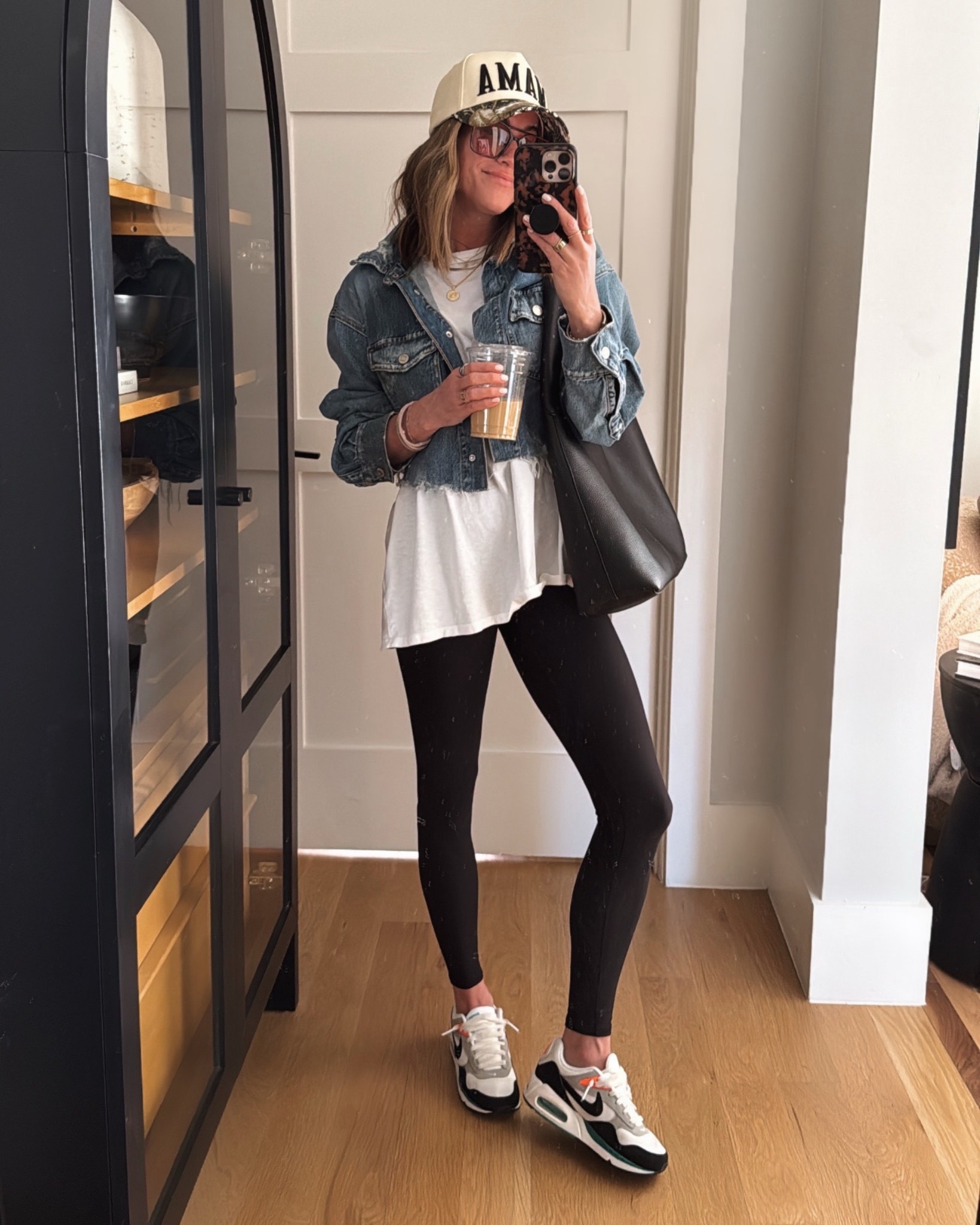 Soccer mom outfit of the day!! My tee is oversized, I’m wearing size xs. Jacket is true to size!