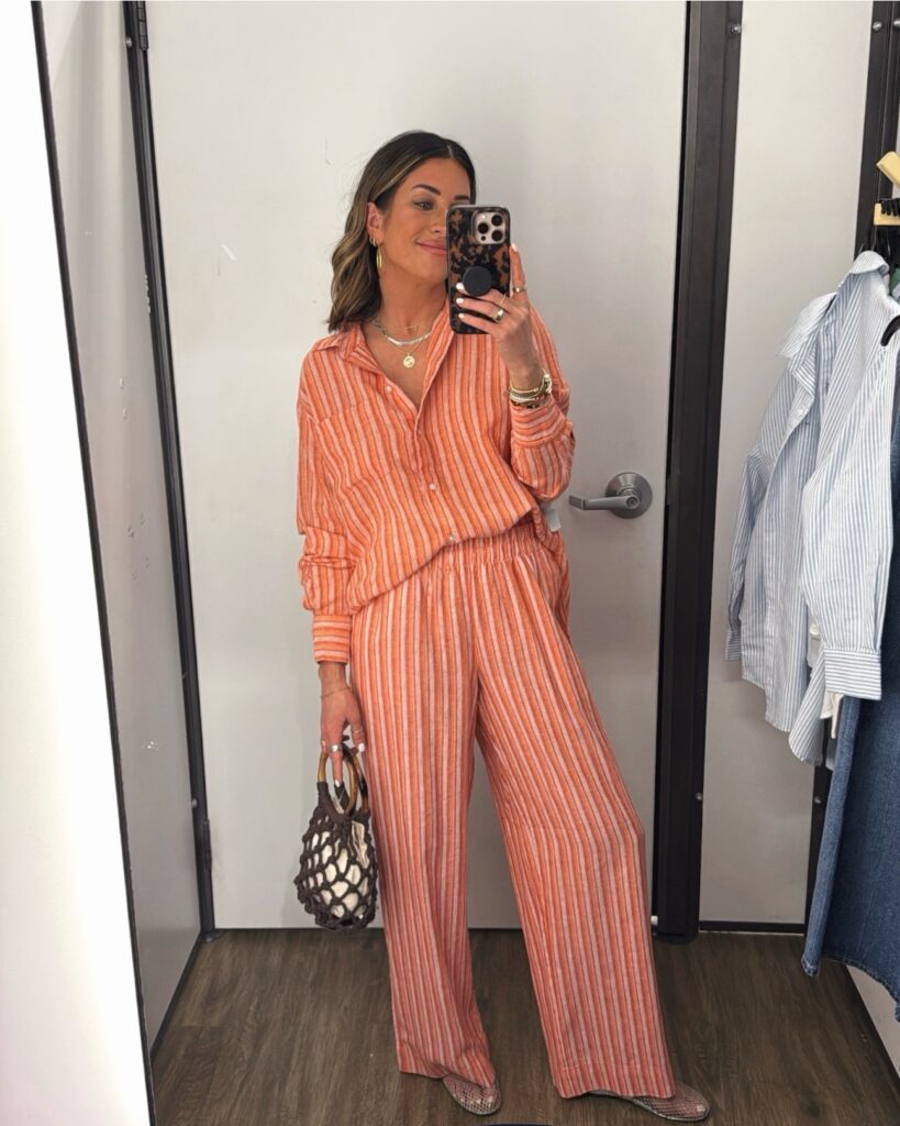 Linen-Blend Loose Button-Down Shirt // Pants // Bag // Necklace //Necklace // Necklace