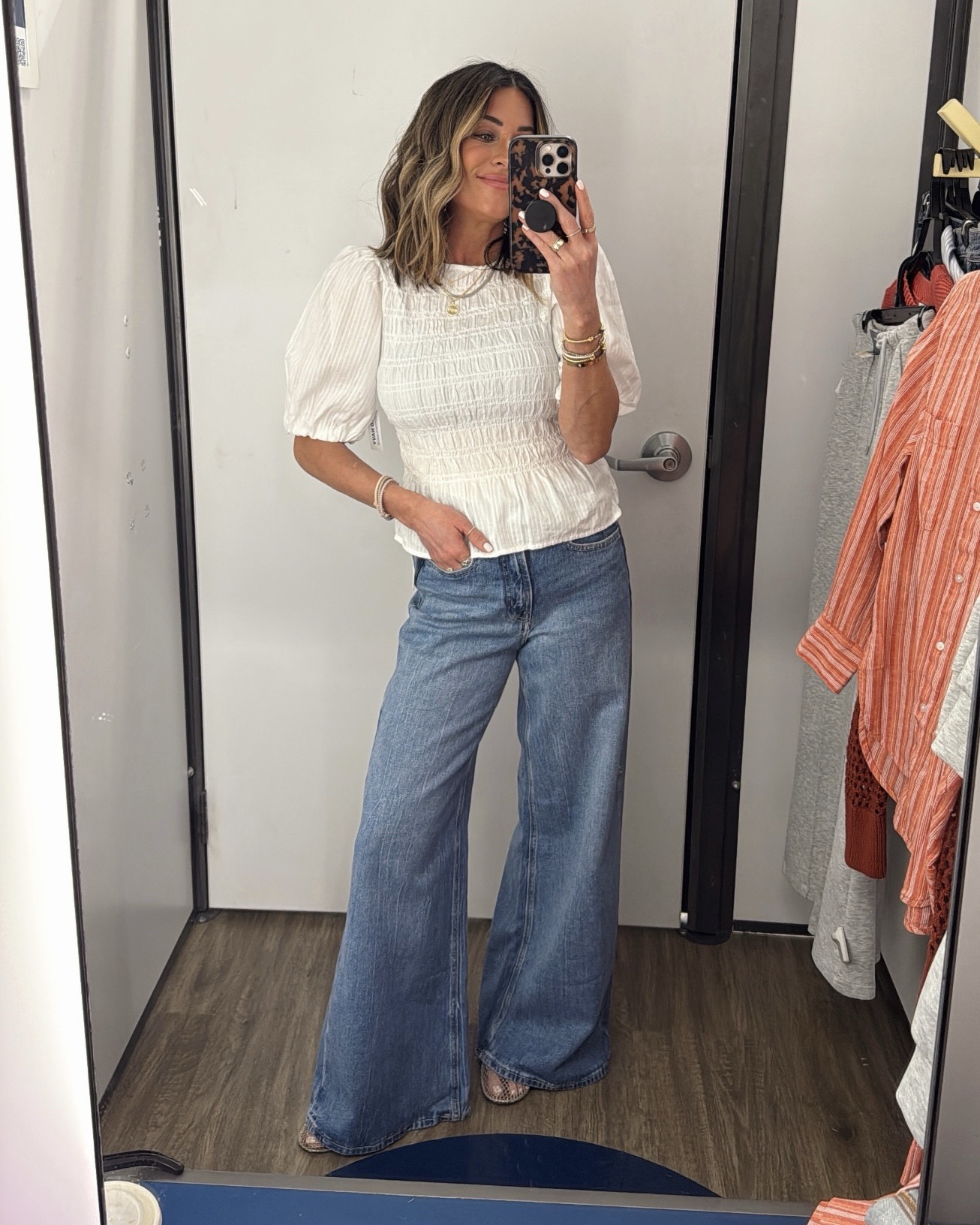 Smocked Top // Pants // Flutter Sleeve Slash Top // Pants // Henley Sweater // Shorts // Top //Pull On Shorts// Sweater Polo // Mockneck Top // Leggings // Sandals // Jeans // White Jeans // Sandals // Belt // Vest // Tee // Leggings // Sports Bra